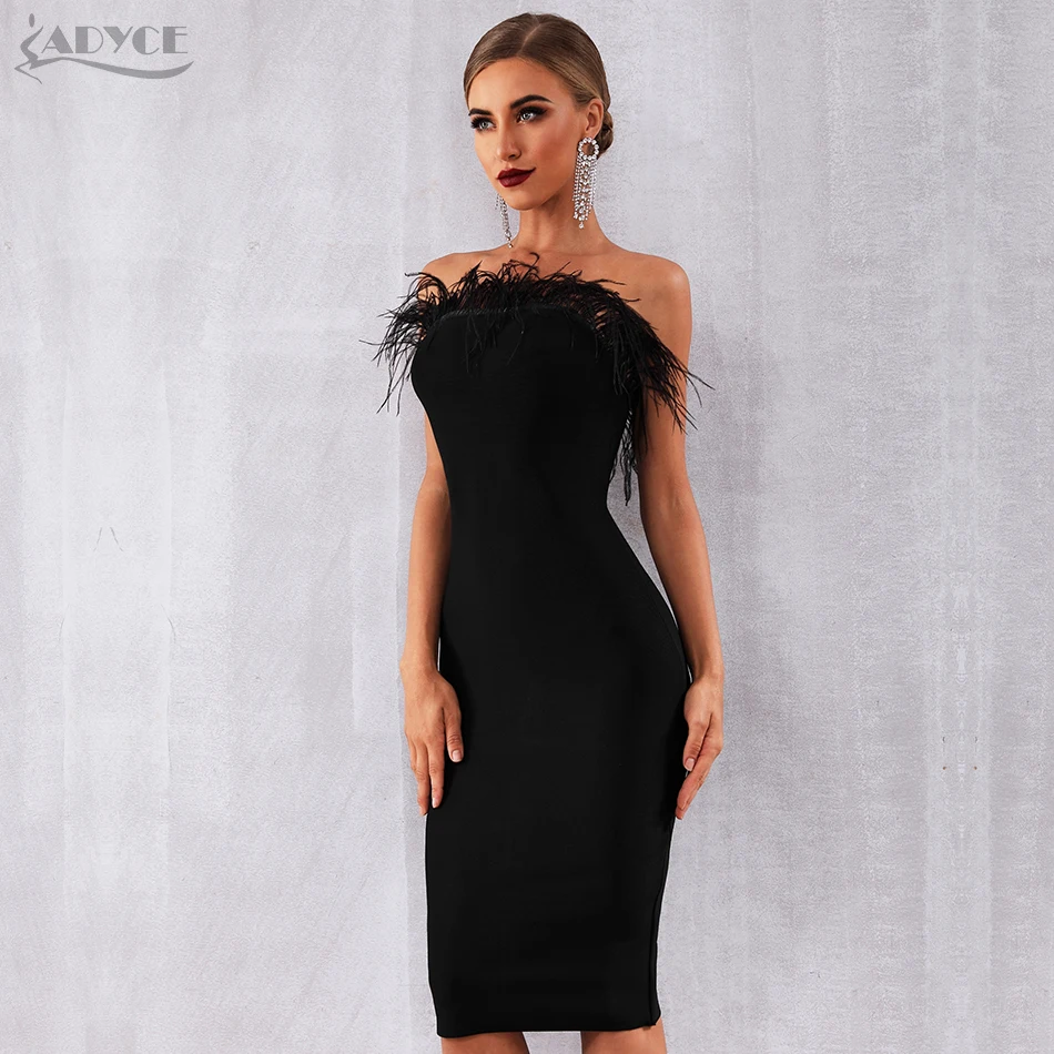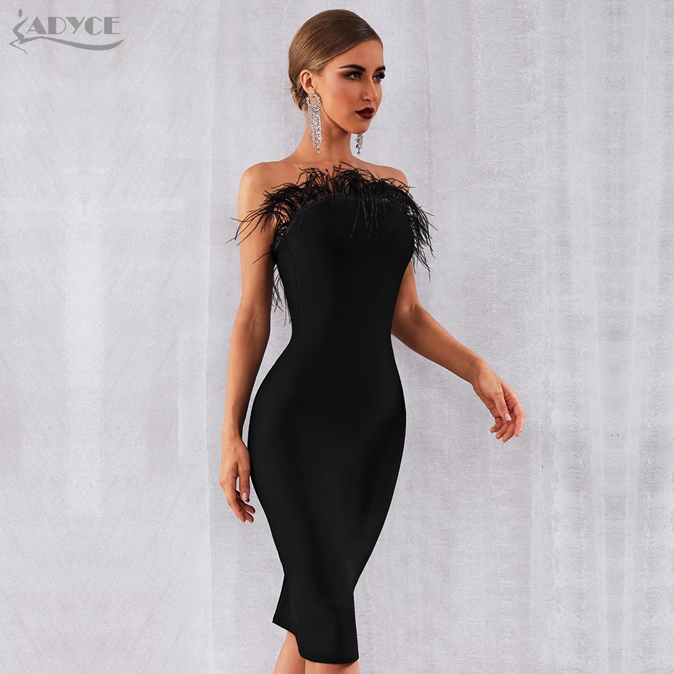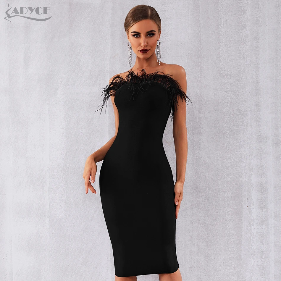 Product Name: Adyce 2019 nouveau été femmes robe de pansement Vestidos Sexy noir plumes sans manches sans bretelles moulante Club célébrité robe de fête